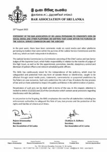 පසුගිය සති කිහිපය තුළ සමාජ මාධ්ය ඔස්සේ අධිකරණ සේවා කොමිෂන් සභාව සහ අධිකරණ පද්ධතියේ විෂය පථයට අයත් කාරණා සම්බන්ධයෙන් පළ වී ඇති අදහස් පිළිබඳ නීතිඥ සංගමයෙන් විශේෂ නිවේදනයක් නිකුත් කර තිබේ.
