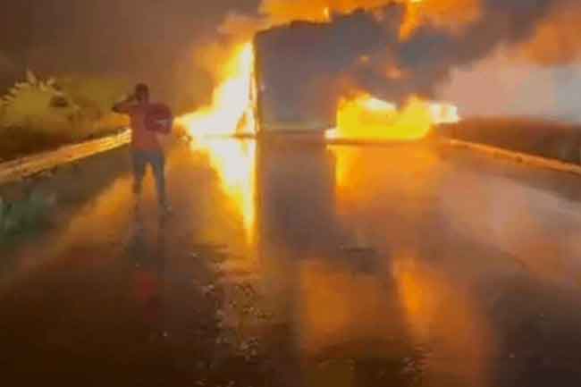 බස් රථය සම්පූර්ණයෙන්ම ගිනිගෙන තිබේ.