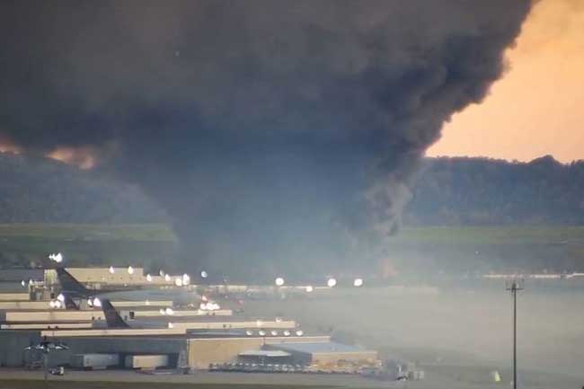 අමෙරිකාවේ කෙන්ටකි ප්රාන්තයේ ලුයිස්විල් ජාත්යන්තර ගුවන්තොටුපොළේදී භාණ්ඩ ප්රවාහන ගුවන් යානයක් කඩාවැටී ගිනිගෙන තිබේ.