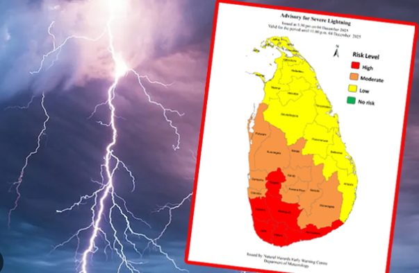 කළුතර, රත්නපුර, ගාල්ල සහ මාතර දිස්ත්රික්ක සඳහා ප්රබල අකුණු පිළිබඳ අවවාදාත්මක නිවේදනයක් කාලගුණවිද්යා දෙපාර්තමේන්තුව විසින් නිකුත් කර තිබේ.