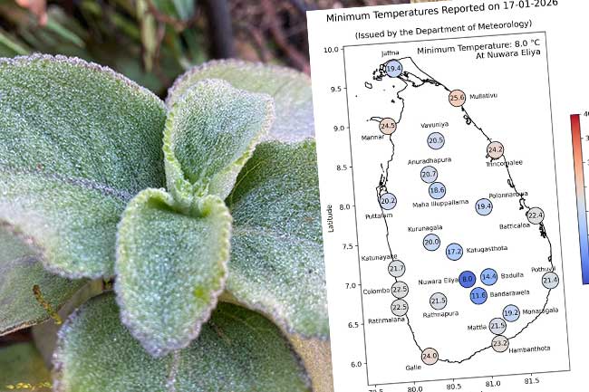 එසේම කාලගුණ විද්යා දෙපාර්තමේන්තුවේ ප්රාදේශීය දත්ත ලබාගන්නා මධ්යස්ථානවලින් වාර්තා වූ අවම උෂ්ණත්ව අගයන් සෙල්සියස් අංශකවලින් සිතියමක දැක්වෙන බවද සඳහන් කරයි.