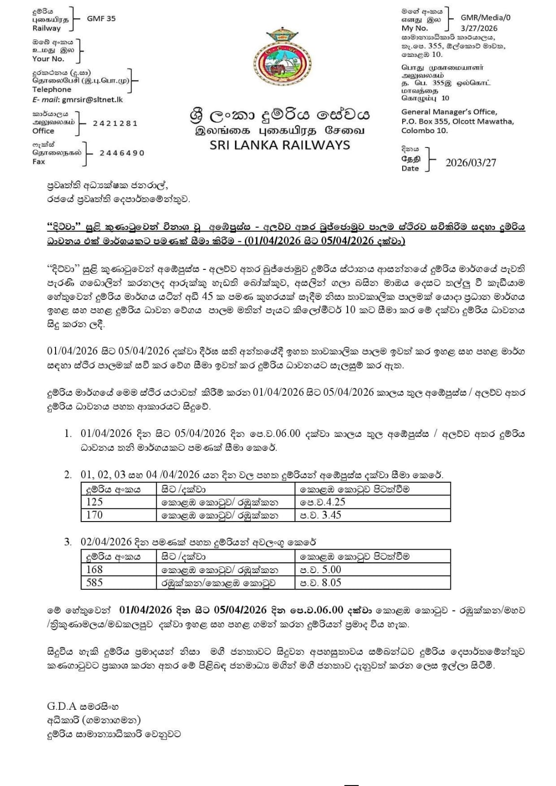 ඒ සම්බන්ධයෙන් ශ්රී ලංකා දුම්රිය සේවය නිකුත් කළ නිවේදනය පහතින් දැක්වේ.