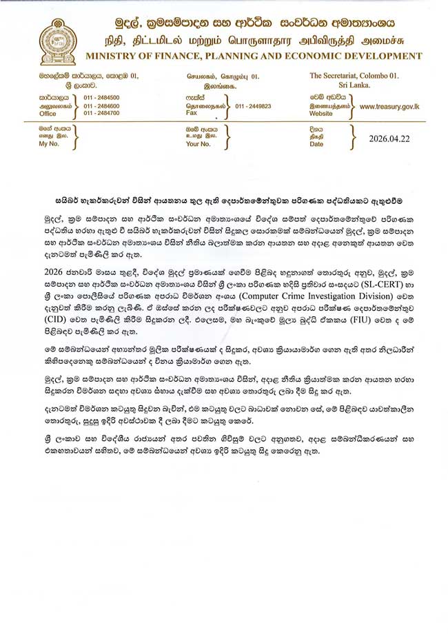 මුදල්, ක්රම සම්පාදන සහ ආර්ථික සංවර්ධන අමාත්යංශයේ විදේශ සම්පත් දෙපාර්තමේන්තුවේ පරිගණක පද්ධතිය හරහා ඇතුළු වී සයිබර් හැකර්කරුවන් විසින් සිදුකළ සොරකමක් සම්බන්ධයෙන් මුදල්, ක්රම සම්පාදන සහ ආර්ථික සංවර්ධන අමාත්යංශය විසින් නීතිය බලාත්මක කරන ආයතන සහ අදාළ අනෙකුත් ආයතන වෙත දැනටමත් පැමිණිලි කර ඇති බව දැනුම් දී තිබේ.