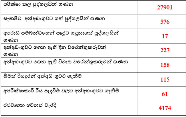 පුද්ගලයින් 27901ක් පරීක්ෂා කර ඇති අතර, අපරාධ සම්බන්ධයෙන් සෘජුව හඳුනාගත් පුද්ගලයින් ගණන 17ක් බව සඳහන් වෙයි.